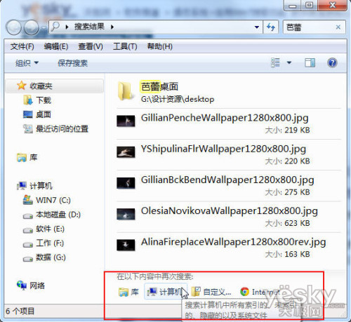 點擊“查看更多結(jié)果”,即可打開Windows 7資源管理器的搜索界面。下圖紅框中提供了更多搜索范圍,我們可以選擇更多的搜索范圍做深度搜索。