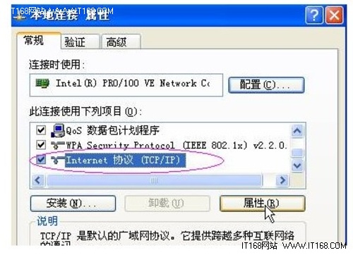 2.1. 啟動(dòng)電腦,右鍵單擊桌面或“開(kāi)始”中的“網(wǎng)上鄰居”選“屬性”,右鍵單擊“本地連接”選“屬性”,選中“Internet協(xié)議(TCP/IP)”,點(diǎn)擊“屬性”: