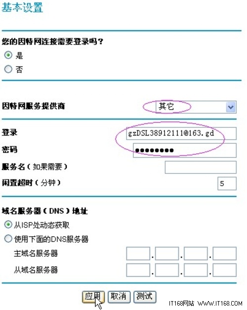 4.1.1. 第一個(gè)選擇項(xiàng)”您的因特網(wǎng)連接需要登錄嗎?”,選擇“是”,”因特網(wǎng)服務(wù)提供商”選擇“其它”,在”登錄”和”密碼”后面的空白欄中分別鍵入寬帶帳號(hào)和密碼,然后點(diǎn)擊“應(yīng)用”,如圖: