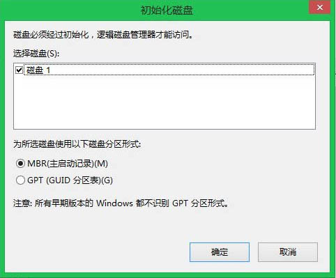 3、對剛才的win8.1 with Bing虛擬磁盤初始化,根據自己電腦是否使用傳統BiOS或UEFI引導,分別創建MBR主啟動記錄或GPT分區;