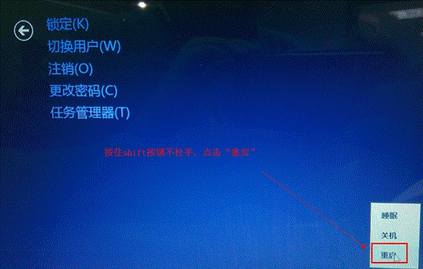2. 按住鍵盤Shift按鍵不要松手,鼠標點擊“重啟”快速進入修復(fù)界面;