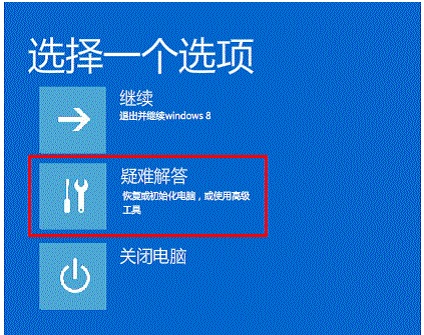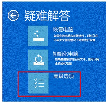 3. 將看到恢復(fù)界面,選擇“高級回復(fù)選項”---“疑難解答”;