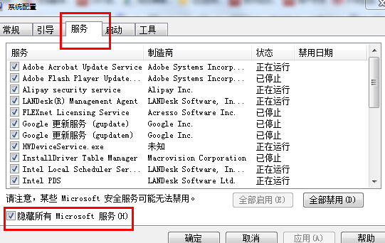 對“系統配置”對話框中的“服務”選項卡,點擊或單擊以選中“隱藏所有微軟服務”復選框,然后點擊或點擊禁用所有;