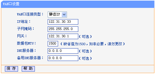如果您的上網(wǎng)方式是靜態(tài)IP,也就是說您向網(wǎng)絡服務商(電信或網(wǎng)通)申請的寬帶是固定IP地址,并且網(wǎng)絡服務商提供您所有的外網(wǎng)的IP地址信息: 包含IP地址(IP Address)、子網(wǎng)掩碼(Subnet Mask)、網(wǎng)關(Gateway)、以及DNS服務器地址。那么您按照如下方式設置您的路由器: