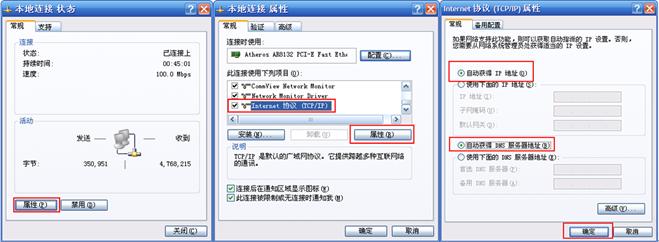 (若電腦右下角沒有網卡圖標,進入方法為"開始--控制面板--網絡連接--雙擊本地連接"),然后按照下圖進行配置即可。