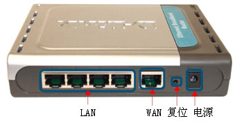 將一條以太網(wǎng)纜線的一端插入DI-504后面板上的WAN端口,另一端插入您的DSL/Cable modem上的以太網(wǎng)端口。DI-504前面板的WAN口的LED指示燈亮,表明操作正確。