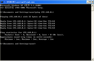 選擇自動獲得IP地址。點擊確定待本地連接顯示已連接上以后,打開命令提示符,輸入命令ping 192.168.0.1,回車。若出現(xiàn)如下界面,則說明和路由器已經(jīng)連通。