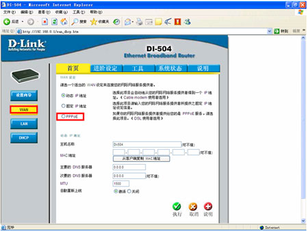 點擊確定后,進入DI-504配置界面,單擊左側(cè)WAN按鈕。
