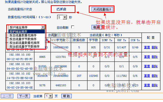 第4步:開啟流量統(tǒng)計之后,單擊配置列下的刪,把所有的都刪掉,然后就可以看到最新局域網(wǎng)內(nèi)所有使用這個路由器的電腦流量使用情況了,通過一些排序我們就可以看到具體是那個ip使用的流量最大,如果他使用最大的話,及有可能就是正在下載一些大文件或是看視頻了。