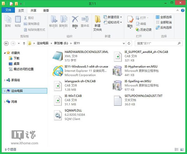 7、解壓后,E:IE11文件夾自動生成:IE_SUPPORT_amd64_zh-CN.CAB、IE-Win7.CAB、ielangpack-zh-CN.CAB、SQMAPI.DLL以及IE-Hyphenation-en.MSU、IE-Spelling-en.MSU。