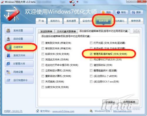 這里說的優(yōu)化工具有很多種,一般支持WindowsVista的優(yōu)化工具,都能用來優(yōu)化WIndows7,比如Vista優(yōu)化大師(進入下載),Vista總管(進入 下載)等,當然那些專門設計給Windows7的優(yōu)化軟件也可以達到一樣的效果,比如Windows7優(yōu)化大師(進入下載)、Windows7總管等等。這些工具中的系統(tǒng)設置中,右鍵設置都有 添加獲得管理員權限的功能,這里就不詳細說明了,大家自己找一下即可。