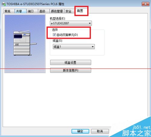 3、打開屬性菜單后,會出現一個顯示打印機屬性的窗口,單擊“配置”選項卡,勾選“選件”下的“自動雙面單元”。