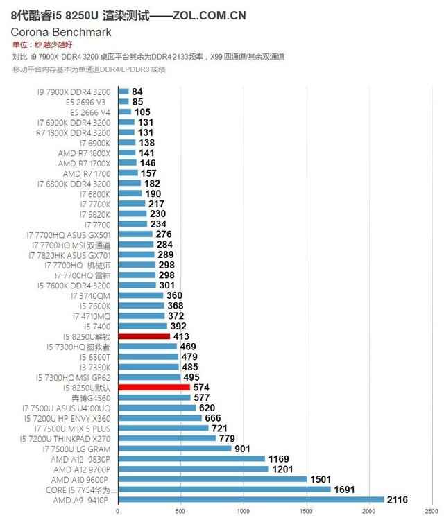 但是,Corona Benchmark 這款軟件的測試時間比較長,i5 8250U 相對功耗限制最寬松、最強悍的i7 7500U 優勢不大,也只是略微領先桌面雙核的奔騰G4560處理器。