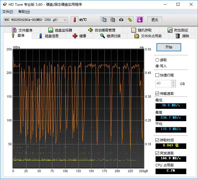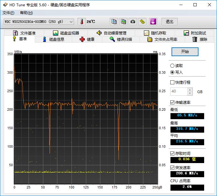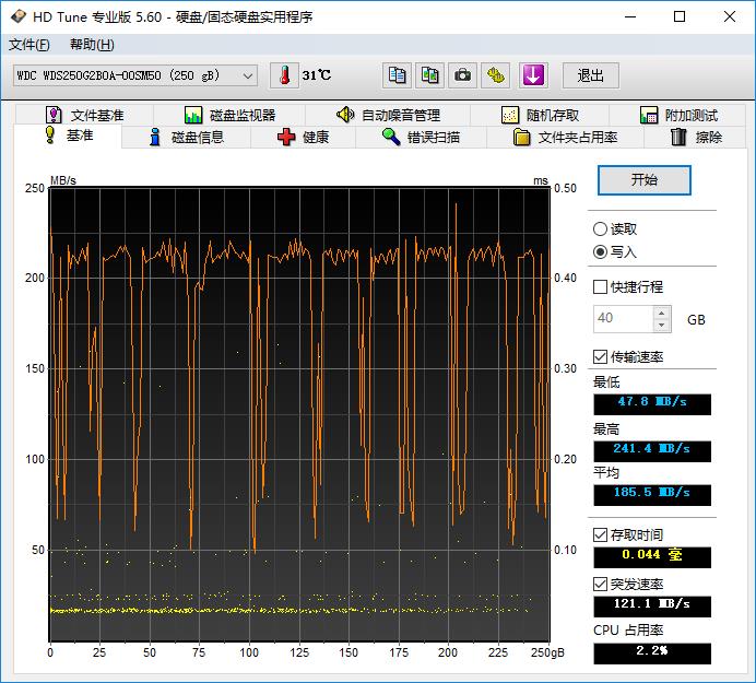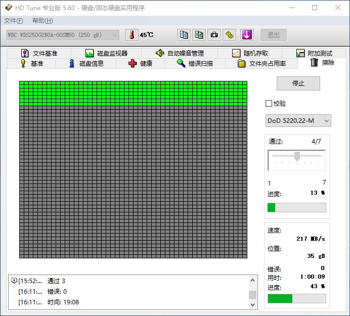 對(duì)SSD的擦除采用HD TUNE對(duì)SSD進(jìn)行持續(xù)擦寫,截圖中可以看到藍(lán)盤的寫入速度始終維持在200MB左右,藍(lán)盤的顆粒大致相當(dāng)于群聯(lián)封裝“TT”顆粒的性能。
