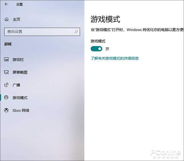除了錄屏以外,Win10還內置了一項游戲模式。原理是通過提升操作系統對游戲的響應效率,以及為游戲專門保留內存來實現。該功能位于“Windows設置”→“游戲”→“游戲模式”頁面,開啟后可自動屏蔽游戲時所接收的系統通知,如果你的游戲運行不暢,可以先來試試它,效果還不錯。