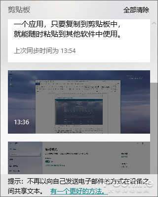 Win10自帶了全局剪貼板,通過Win+V調出。無論圖片還是文字,只要用鼠標點擊一下,即可快速粘貼到需要的應用。Win10會自動記錄多個剪貼結果,也可以自動實現跨平臺同步。當年張總的一句笑談,從A電腦復制到B電腦,如今已經變成了現實。