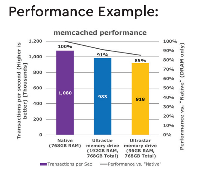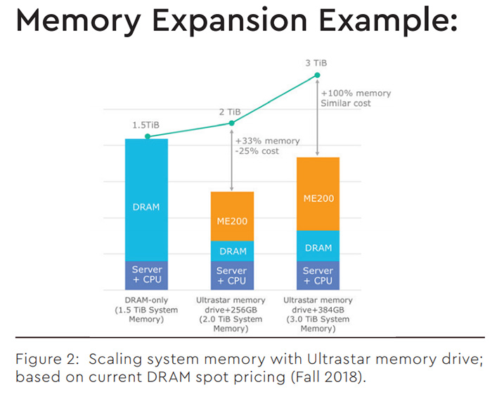 傳統方式下服務器配置1.5TB DRAM內存,如果使用Ultrastar DC ME200硬盤,內存容量提升到2TiB的同時還能減少25%的TCO成本,如果是同樣的成本下,使用Ultrastar DC ME200硬盤組合可以實現3TiB內存。