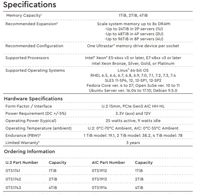 Ultrastar DC ME200硬盤有U.2 15mm或者HHHL規格的AIC兩種形式,支持PCIe 3.0 x4通道,待機功耗9W,活動功耗25W,容量有1Tib、2TiB及4TiB三種,4U服務器中8路CPU最多可配置96TiB的擴展內存,支持英特爾Xeon E5/E7 v3及Xeon銅銀金鉑處理器。