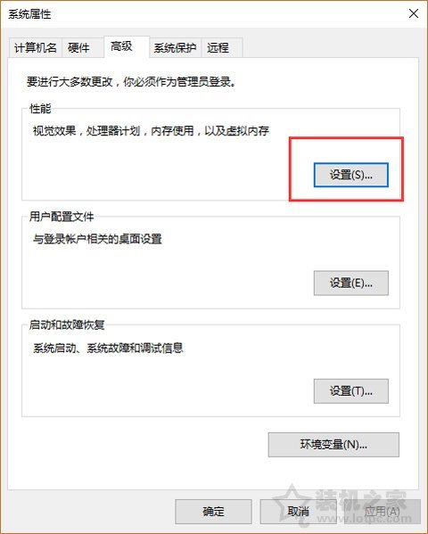 3、在系統屬性窗口中,我們再【高級】選項卡中,點擊性能下面的“設置”按鈕,如下圖所示。