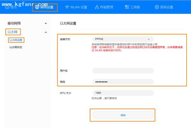 3. 選擇“網絡設置 > 以太網 > 以太網設置”。在連接方式下拉框中,選擇“PPPoE”(此處以PPPoE連接方式為例說明。具體如何選擇網絡連接方式,請參照下表進行判斷),填寫寬帶服務商提供給您的上網帳號和密碼,點擊保存。