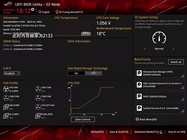 當電腦主機開機的一瞬間,我們在鍵盤上按“DEL”鍵或者“Delete”鍵,反復按幾次,直到進入BIOS設置界面中,目前在BIOS識別的內存頻率為2133MHz,我們按下F7鍵進入到高級模式設置。