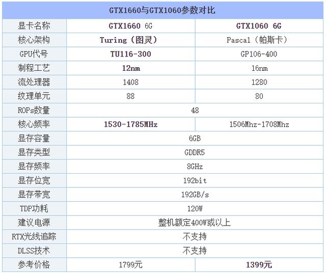 從兩者參數對比已經看出,GTX1660是GTX1060的升級版,在流處理器、紋理單元、核心頻率都有小幅升級,不過GTX1660采用了全新的圖靈架構(Turing),擁有更先進12NM工藝制程,在功耗控制上無疑會更好。雖然在參數上只有小幅升級,但是架構對顯卡的影響較大,往往新架構可以讓顯卡擁有更高效的性能體驗,更好的優化等特點。