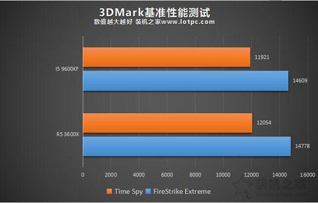 基于DX12環境的Time Spy,AMD銳龍R5 3600X跑了12054分,而intel酷睿i5-9600KF跑了11921分,R5-3600X多跑了133分。而基于DX11環境的FireStrike Extreme,AMD銳龍R5 3600X領先了169分,總的來說,R5-3600X完勝,但是兩者之間差距較小,完全可以忽略不計。