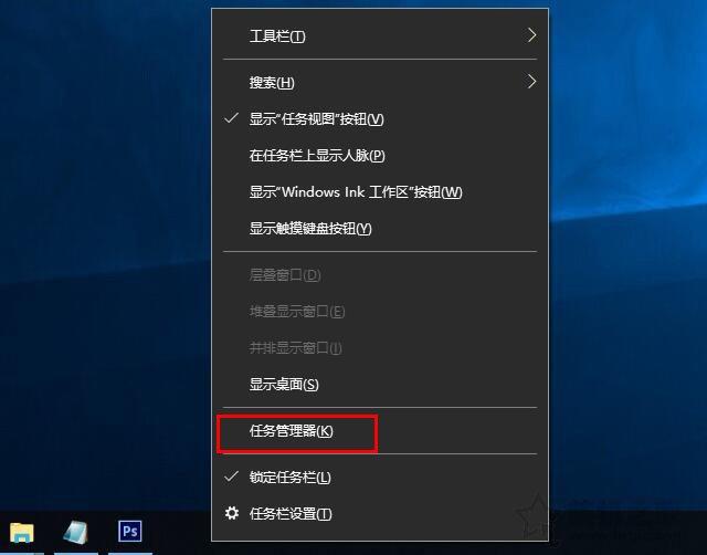 我們在設備管理下查看的CPU是核數+線程數總和,所以如果想要查看具體幾個核心幾個線程,我們還可以使用其它的方法來查看。以win10系統為例,我們將鼠標指針移動至任務欄空白處并右鍵之后選擇“任務管理器”,如下圖所示。