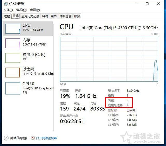 在任務管理器中,我們查看內核就是物理核心,邏輯處理器就是線程,如下是四核四線程的一款處理器,此外我們還可以借助CPU-Z或者魯大師來查看核心數量和線程數量。