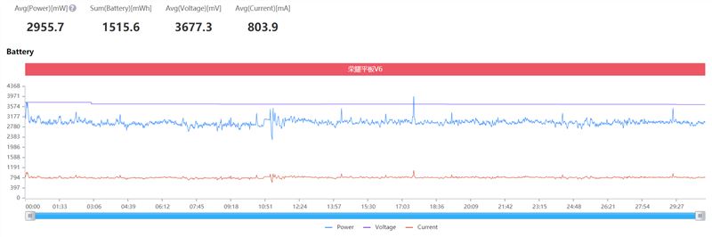 播放視頻30分鐘,掉電約6%,平均功耗2955.7mW,預計榮耀平板V6的視頻續航在9小時左右。