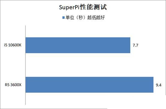 SuperPi是專門針對cpu單線程性能的測試,單核性能也正是Intel的傳統優勢項目,i5-10600k憑借更高的頻率優勢在該測試項目中完勝R5 3600X。