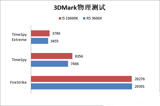 3DMark的物理測試,i5 10600k和R5 3600X在DX11的FireStrike測試中,表現基本一致,不過到了DX12的TimeSpy測試中i5 10600k的表現明顯比R5 3600X更好。