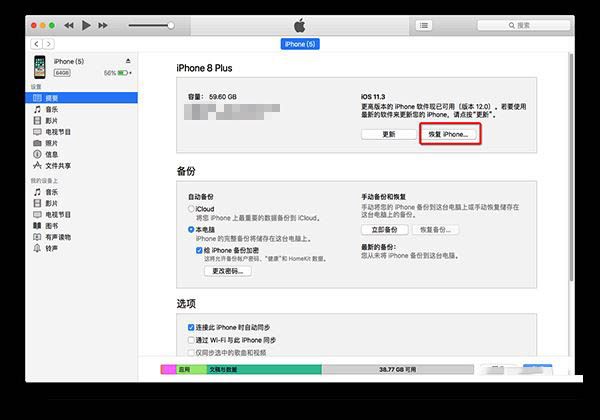 3、在 iTunes 的設備信息界面,按住 Option 鍵(Windows 用戶在按住 Shift 鍵),單擊「恢復...」按鈕;