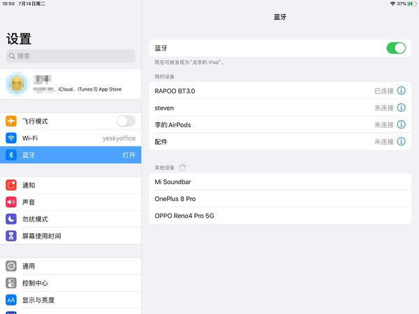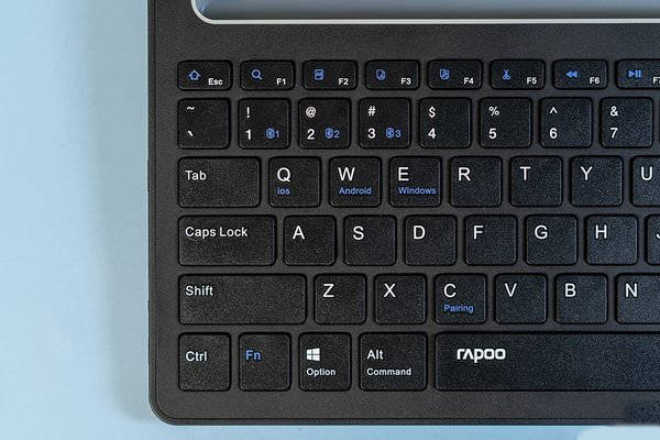 連接方面,在開啟iPadPro藍牙功能之后,在設備商配對名稱為“RAPOOBT3.0”,即可實現(xiàn)配對。雷柏鍵盤的開啟方法則是打開右側(cè)邊框上的開關后,通過Fn+C(鍵帽“Pairing”)開啟鍵盤的配對模式,點擊連接即可完成配對。