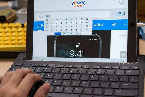 筆者用10.5英寸iPadPro搭配雷柏XK100使用,只需將iPadPro放置在鍵盤頂部的插槽上,鍵盤即可實現(xiàn)支架的作用。作為支架的雷柏XK100很好的契合了10.5英寸iPadPro,既不會對屏幕造成遮擋,接近110度的傾斜角度提供舒適的視覺體驗。