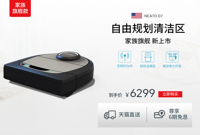 Neato推出了全新的家庭旗艦級Botvac D7 Connected吸塵機器人,是neato首款運用了全新No Go Line “指畫禁越線”功能的吸塵機器人,只需動動手指,就能通過neato app輕松設定不希望Neato清潔的區域。支持2.4G和5G Wi-Fi信號,支持 iOS 和 Android 系統 ,天貓旗艦店售價為6299元。
