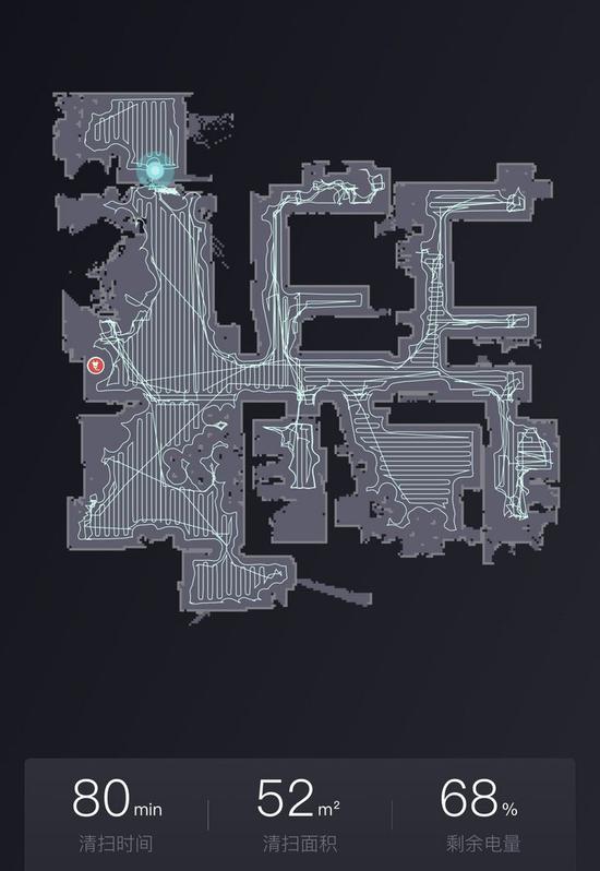 如果是全圖清掃,實際清掃區域為 52 平米,耗時 1 小時 20 分左右,走一圈后還是能剩下 68% 的電量。當然,實際耗時也和掃地機器人遇到的障礙情況有關,假如你家中擋路的東西比較多,自然也需要更長時間的掃描和檢測。
