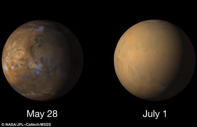 這場沙塵暴始自今年5月28日。剛開始規模還較小,但到了6月20日,已擴散到了火星全球。這張圖片體現了火星表面遭遇沙塵暴前后的巨大變化。從7月底開始,沙塵暴方才逐漸偃旗息鼓。