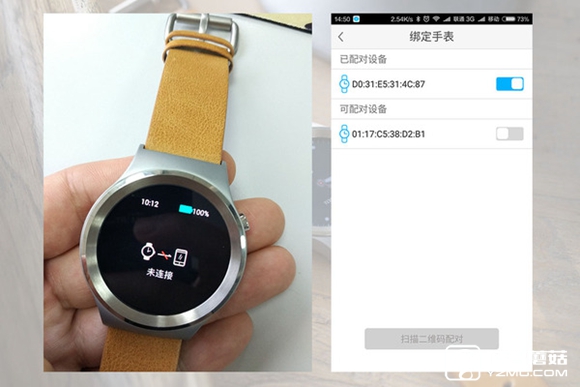 ▲電量很快就充滿(mǎn)了,當(dāng)首次使用時(shí)需要先綁定手機(jī),點(diǎn)擊未連接圖標(biāo)時(shí)會(huì)有一個(gè)藍(lán)牙地址的二維碼顯示在表盤(pán)上,此時(shí)只需要用表達(dá)APP里的綁定設(shè)備界面的掃碼功能即可輕松綁定連接成功,整個(gè)過(guò)程零難度并且非常快捷。