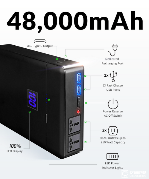 之所以這么全能,是因為Plug不僅擁有常見移動電源的USB接口,還有2個AC接口,可提供250瓦的功率,非常強(qiáng)大。