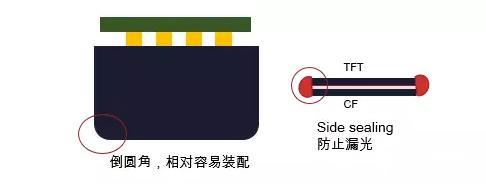 無邊框電視優點明顯,不過這種優點需要面板端配合。無邊框的專用面板與一般面板相比有如下圖的兩個不同點,一個是PCBA相反側的兩個角為圓角(三邊無邊框為例),容易裝配在緊湊的無邊框整機系統中,另外是側面涂有專用封框膠,避免在沒有前框遮住的情況下,屏幕側面有光漏出影響畫質。