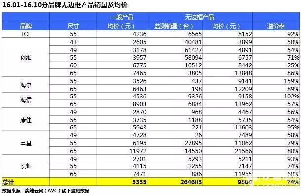 奧維云網(AVC)線下監測數據顯示,同為差異化產品的曲面產品比一般產品高出1.5倍的價格,而無邊框產品的價格差達到1.7倍以上,在整體銷售量上升但銷售額逐年下降的彩電市場,這種單價高、投入少、設計感良好的差異化產品無疑是整機品牌的首選。