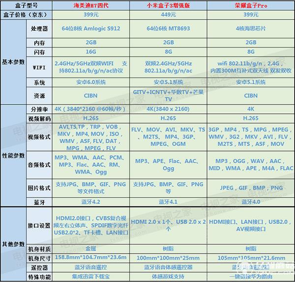 海美迪H7四代、小米盒子3增強(qiáng)版、榮耀盒子Pro 參數(shù)對(duì)比