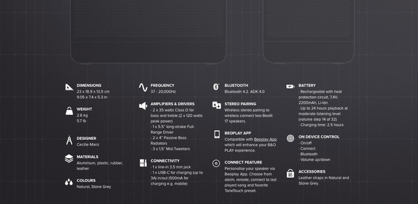 配置方面,Beolit 17 支持藍牙 4.2 及 ADK 4.0 連接。使用支持 aptxCSR 的播放設備,能夠確保聲音的傳輸質量。機身內部配置有兩個 35 瓦 CLASS D 功放,且兩個頻道的峰值輸出功率可達 240 瓦。設備還帶有一個 5.5 英寸長沖程低音喇叭、三個 1.5 英寸高音喇叭以及兩個被動式低音散熱器。