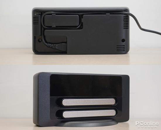 充電底座前方有兩個金屬片,后方還有隱藏式的電線纏繞凹槽,同樣是十分人性化的設計。