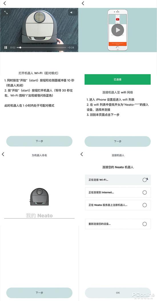 注冊登陸之后,APP會有視頻演示來提示你如何一步步操作讓D7連接上網(wǎng)絡(luò)。同時按住開始按鈕和右側(cè)緩沖器10秒,機(jī)器人將關(guān)閉并重置;再按開始按鈕啟動,等啟動完畢,WiFi圖標(biāo)就會呈呼吸燈狀緩慢明滅。此時手機(jī)需要連接D7釋放的一個熱點,然后回到APP中設(shè)置機(jī)器的WIFI鏈接、命名等。