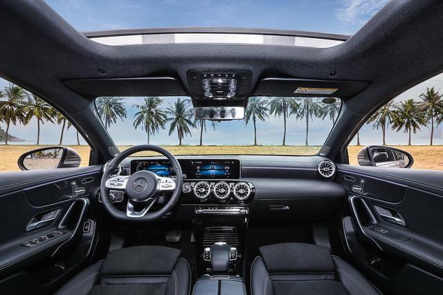 內(nèi)飾上,新A級(jí)延續(xù)了奔馳一貫的風(fēng)格,連屏設(shè)計(jì)再加渦輪式出風(fēng)口可能多少有點(diǎn)新鮮感不足,但這套和S級(jí)(參數(shù)|圖片)有8分相似的內(nèi)飾,在這個(gè)級(jí)別上可是豪華得有點(diǎn)“犯規(guī)”了,同時(shí)視覺效果上乘的一體式液晶屏搭載上MBUX系統(tǒng),日常使用便捷性也是杠杠滴。