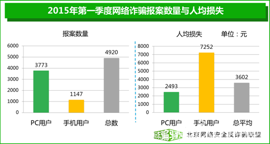 隨著互聯網應用的深入和普及,當今社會已經全面進入互聯網時代。4月28日,北京網絡安全反詐騙聯盟發布的《2015年第一季度網絡犯罪數據研究報告》顯示,網絡詐騙已經成為中國用戶上網最大的威脅之一,2015年1-3月,北京網絡安全反詐騙聯盟共接到網絡詐騙報案4920例,報案總金額高達1772.3萬元,人均損失3602元。