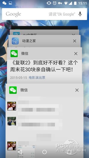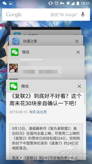 接著回到主界面,看上去微信似乎沒有什么變化。但是,從此以后,當你在微信中閱讀文章時,只要呼出安卓的多任務菜單,就會發現,文章頁已經獨立出去,成為一個多任務標簽了!如此一來,看文章的時候即使有微信消息,也能夠通過安卓的多任務菜單隨意切換文章頁和微信聊天窗口,既不影響聊天,也不影響讀文章!
