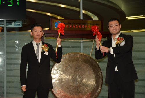 執行董事兼行政總裁程力先生(左)及執行董事兼財務總監Zhang Lake Mozi先生(右)一同主持開巿的敲鑼儀式。